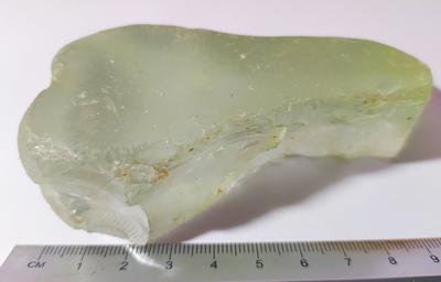 I found this a few years ago on a beach in Nova Scotia, Canada. It's about 10cm in length and about 3cm thick. It is very flat on both sides so it seems to be from a thick block of glass, like a really thick window.